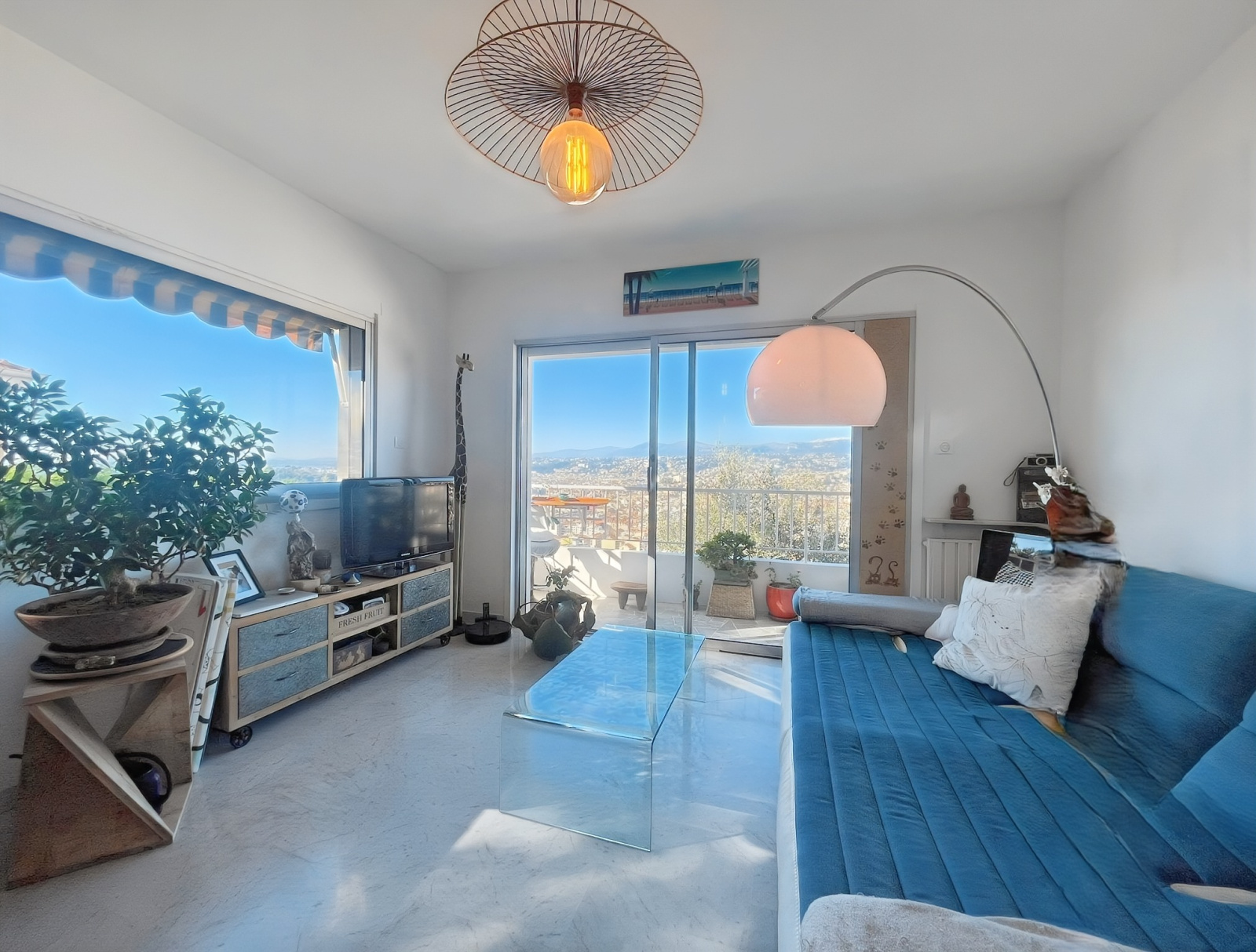 Il se compose d’une cuisine ouverte donnant sur un vaste séjour, prolongeant l'espace vers un balcon de 4 m²offrant une vue mer et sur la ville de Nice. L'appartement dispose également de deux chambres de 11 et 10 m², d'une salle de bain avec douche et d’un WC séparé. Une cave et une place de parking complètent ce bien.